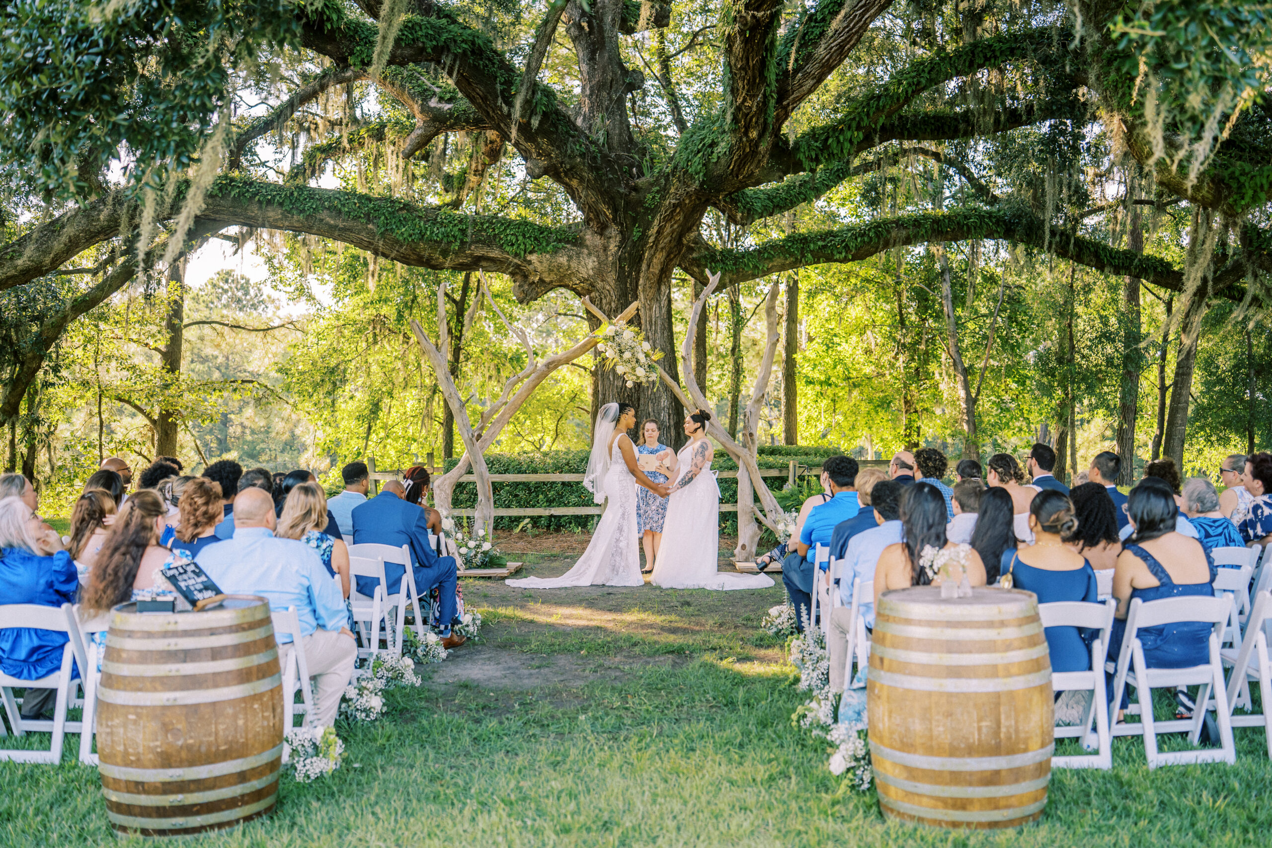 Versatile Venue Options. Couples can choose from the traditional Red Barn (rustic with twinkle lights), The Grainery (modern industrial with a lakeside view), or the Belle Tower (traditional home for intimate gatherings). Picturesque. The giant, moss-draped live oak tree is a favorite for outdoor ceremonies, offering a “fairy tale” atmosphere.