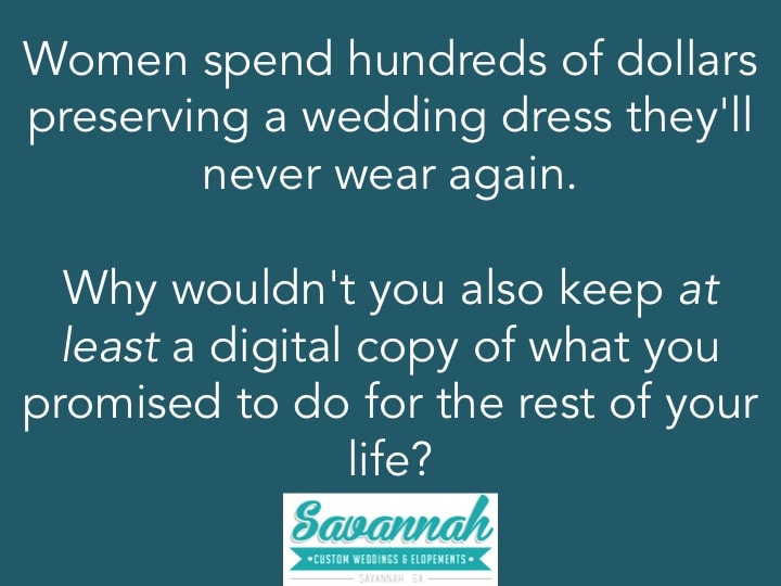 Women spend hundreds of dollars preserving wedding dresses they’ll never wear again. Why wouldn’t you also at least keep a digital copy of what you promised to do for the rest of your life?